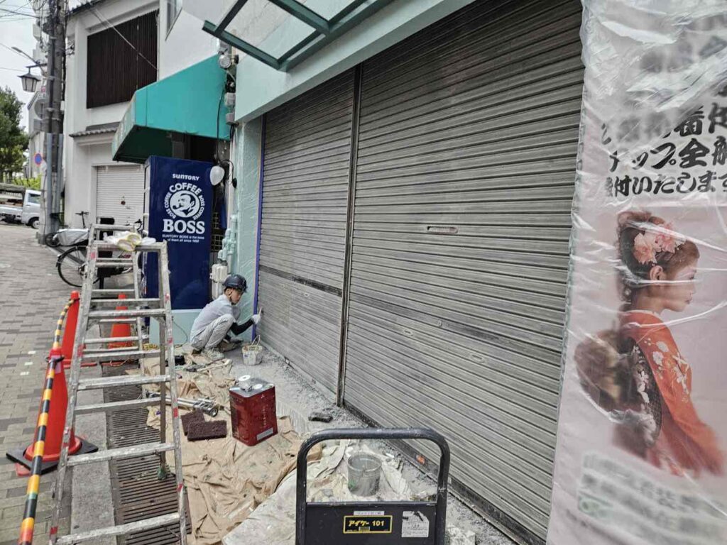 兵庫県伊丹市ひがし商店街 店舗シャッターの塗装工事を進めております
