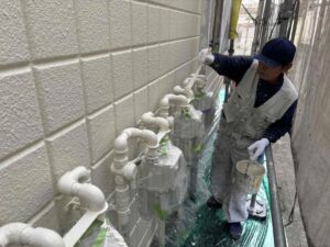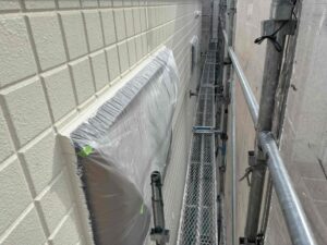 ベランダのシート防水貼りも終わり、現在は順調に外壁塗装を進めております。