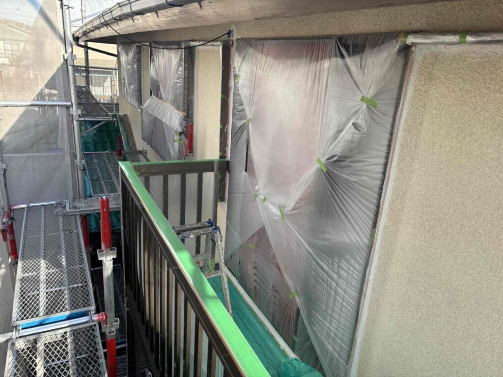 ビニール養生作業が終わり、現在は外壁の下塗り塗装を進めております。