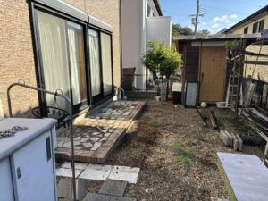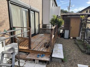 足場工事の前に、お庭のウッドデッキの撤去から進めております。