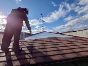 高圧洗浄が終わり、鉄部への錆止め(下塗り)塗装が終わり、現在は屋根の下塗り塗装を進めております。