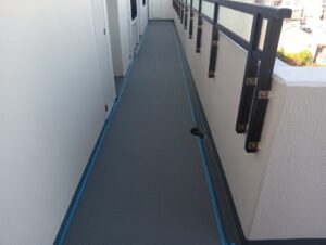 長尺シート貼り工事が終わり、現在は長尺シートとウレタン防水が交わる部分にシーリング打設工事を進めております。
