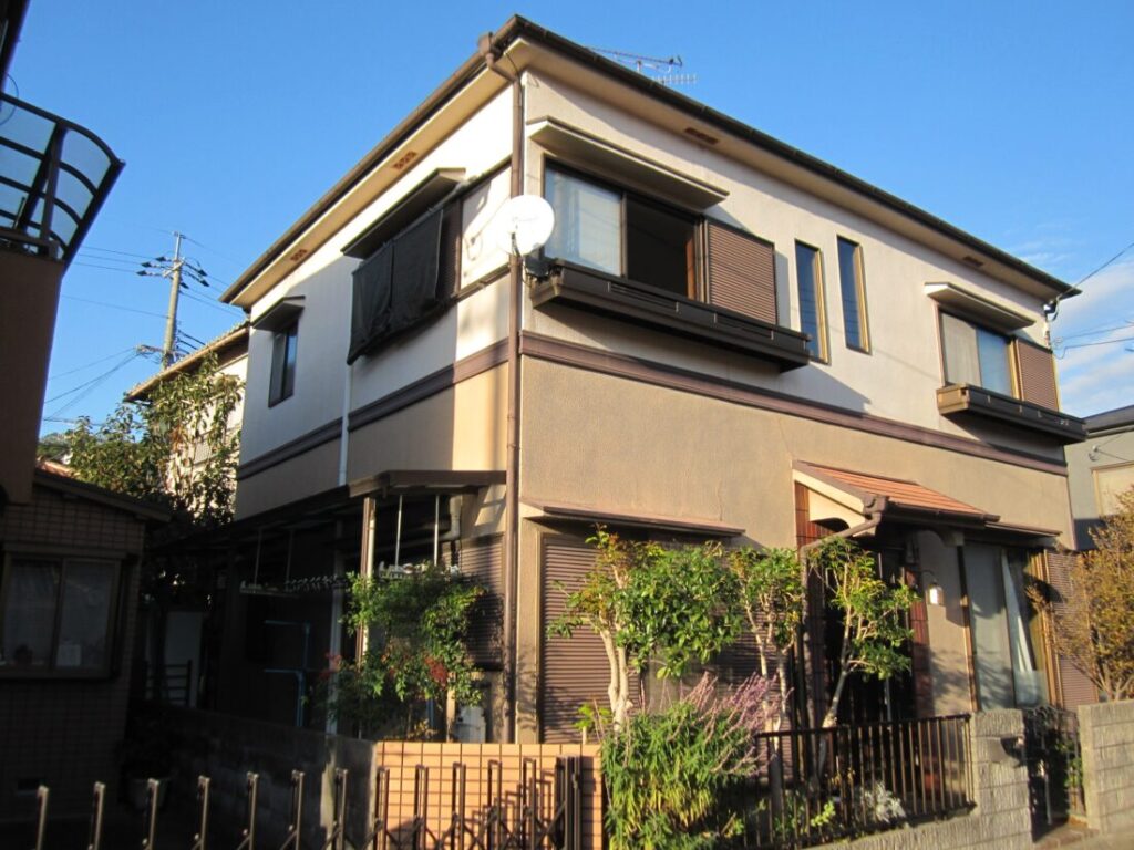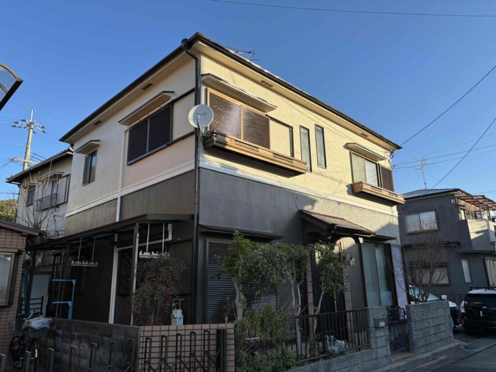 塗膜のチョーキング現象やモルタル壁のひび割れなどの経年劣化が進行している状態で、丁度良い時期に塗装工事のご依頼をいただきました。                                 1階と2階の外壁の間にある帯(幕板)の色を白色に変える事により、それがお洒落なアクセントとなり素敵なご自宅へと生まれ変わりました。                                 非常に耐久性に優れた汚れが付着しにくい塗料を使用しておりますので、長期間に渡り綺麗な外壁を維持していただけると思います。