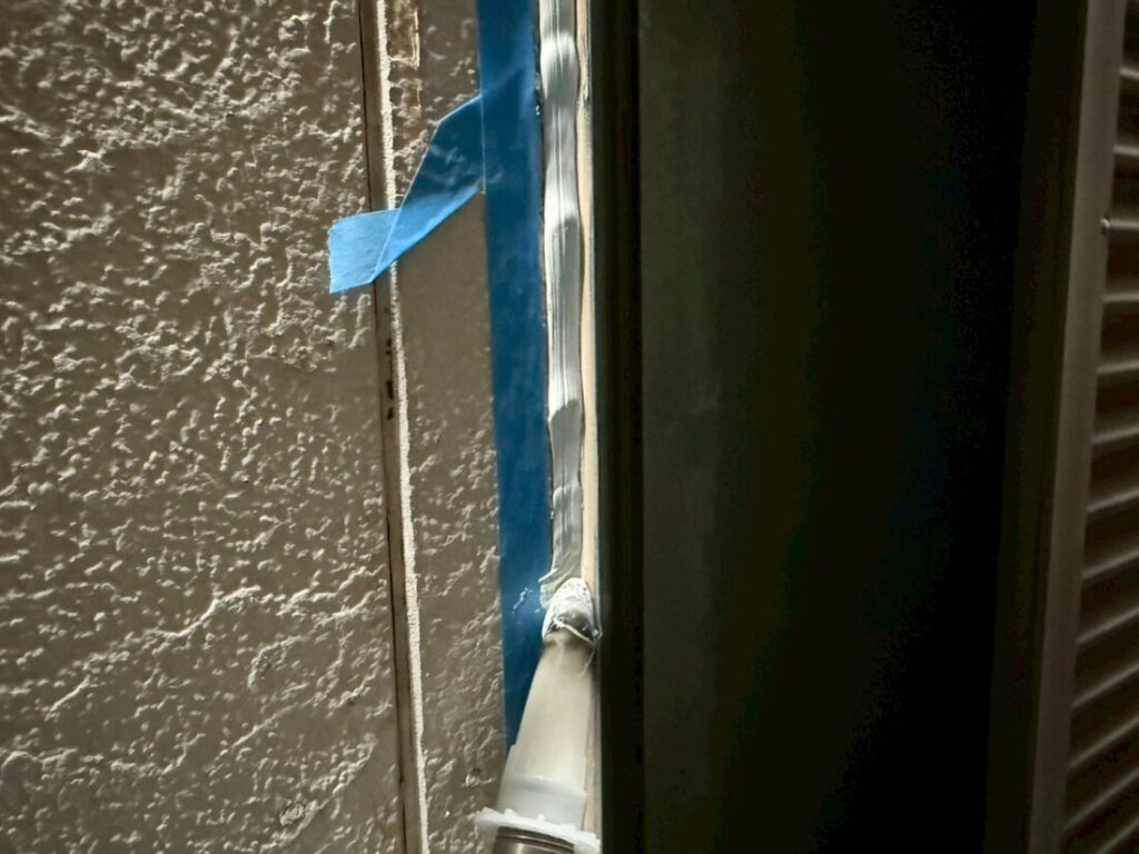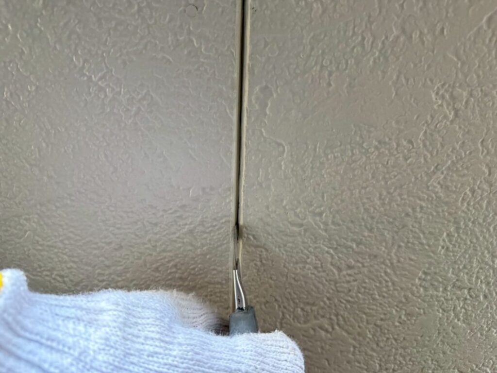 シーリング工事の前に、外壁のボードが反っている部分に新しくビスを打って反りを直していきます