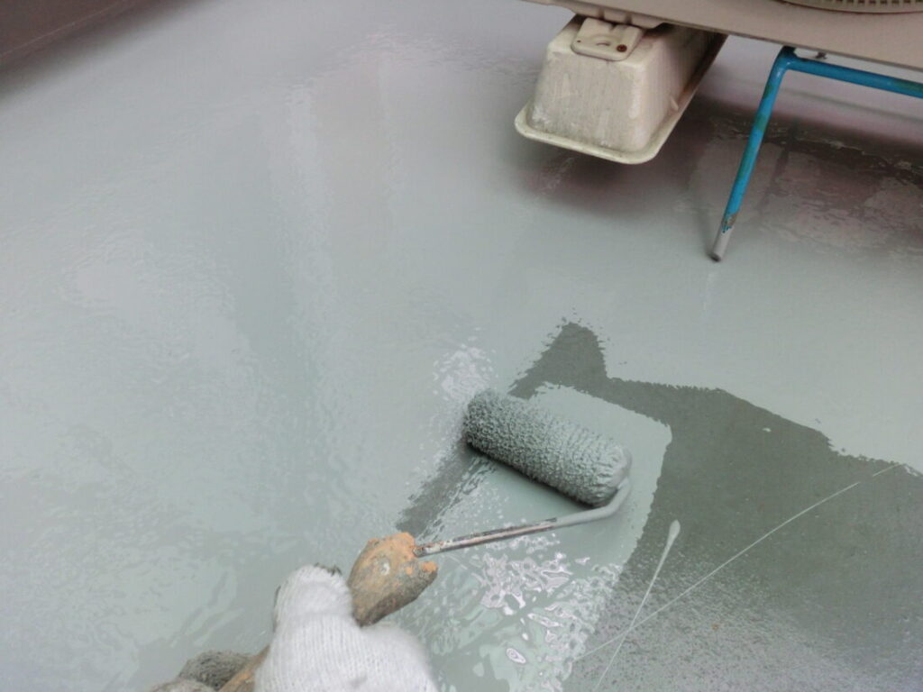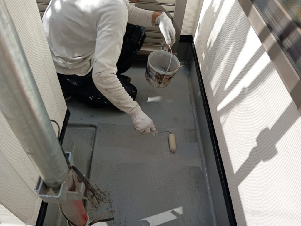 ベランダFRP防水の下塗り塗装です。ベランダのFRP防水も塗り替えを行います