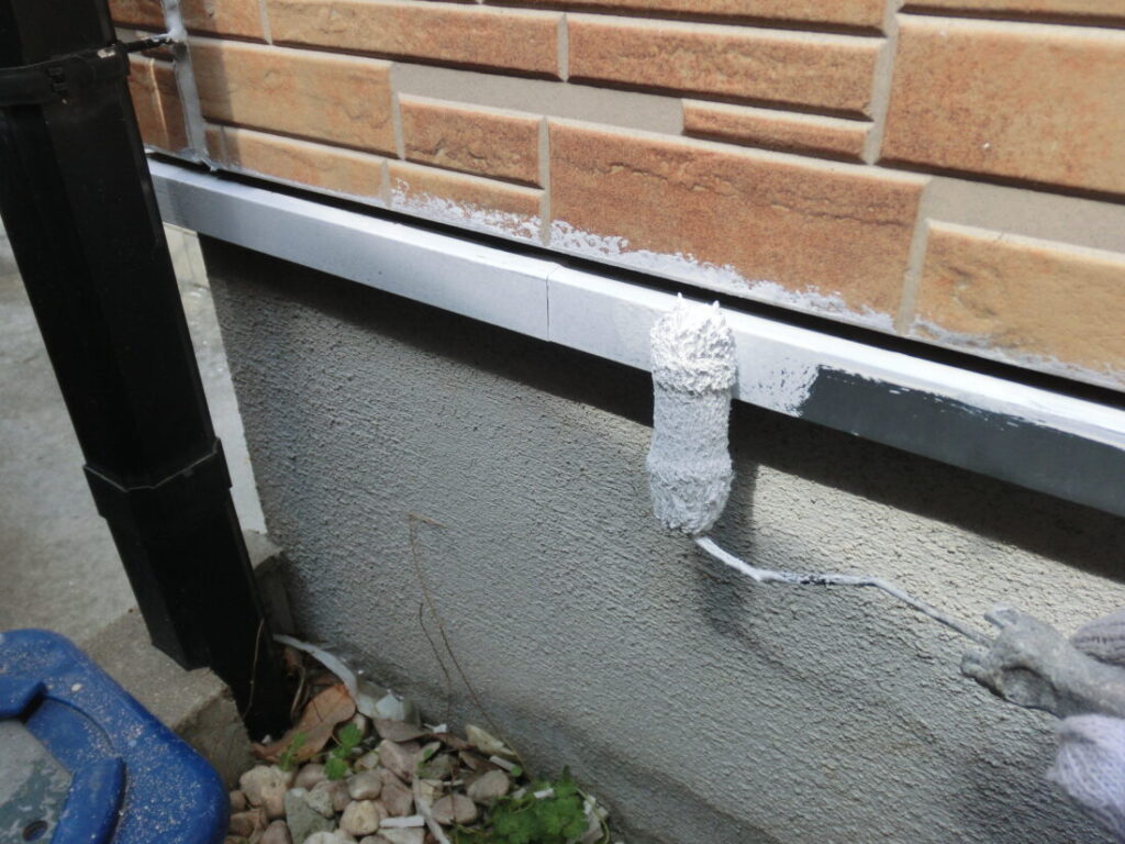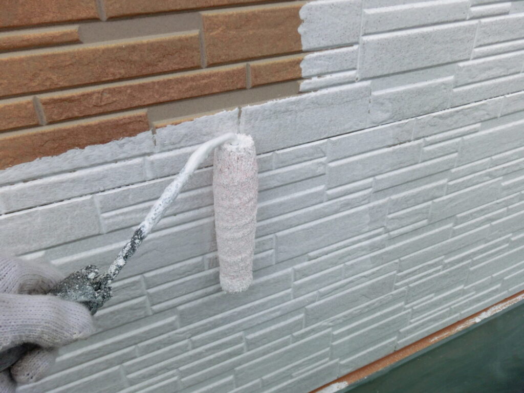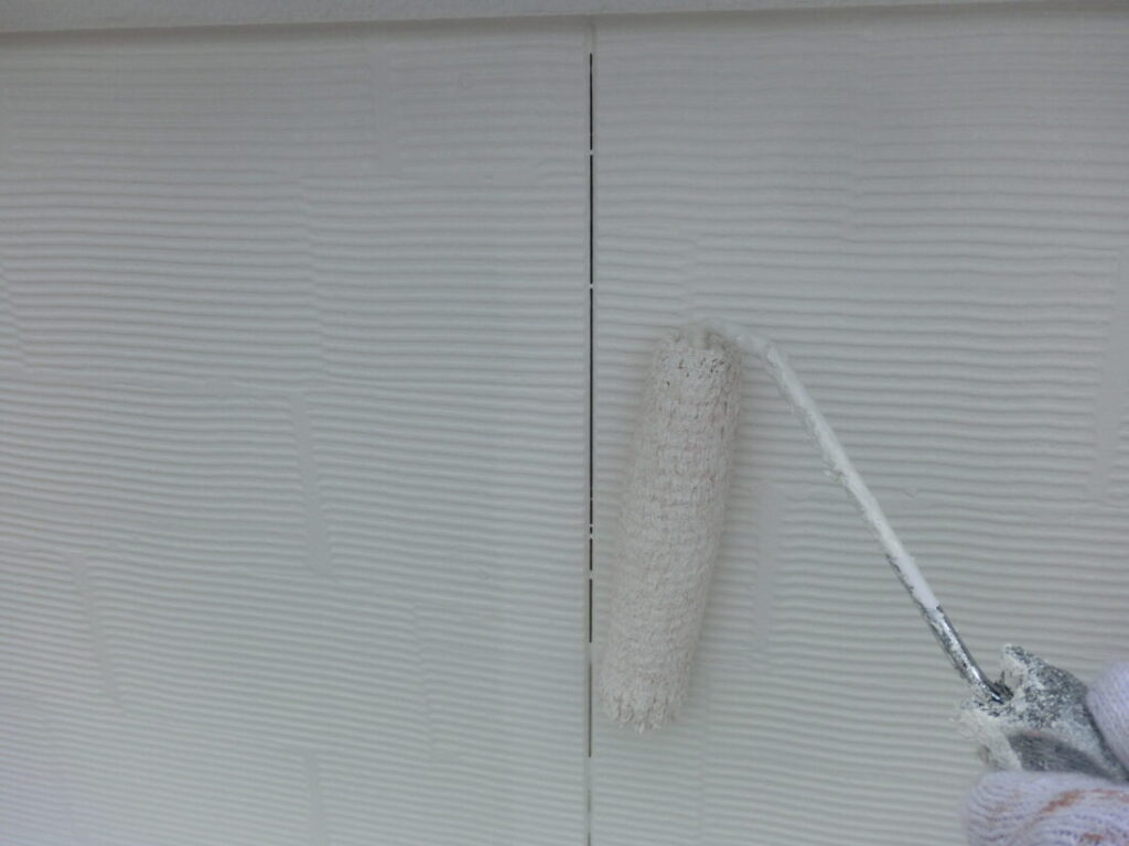 外壁の下塗り塗装です。白色の下塗り塗料を使用しております