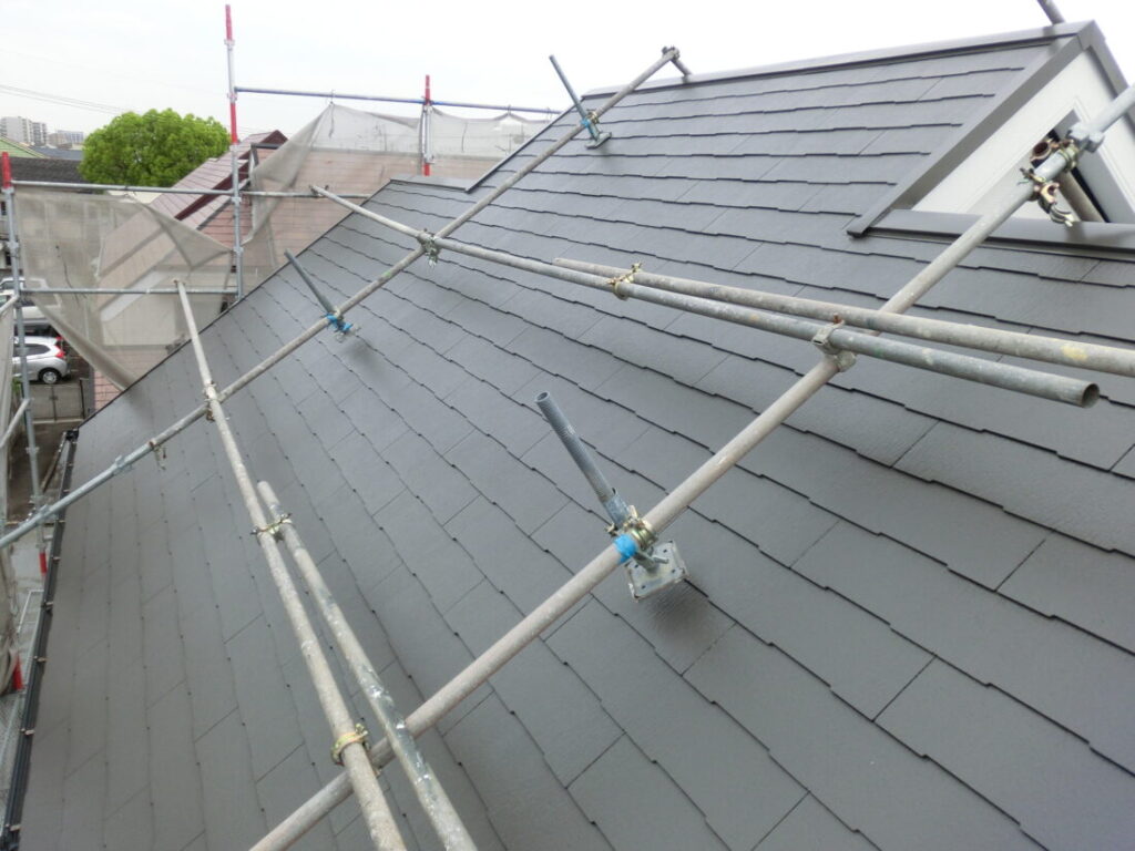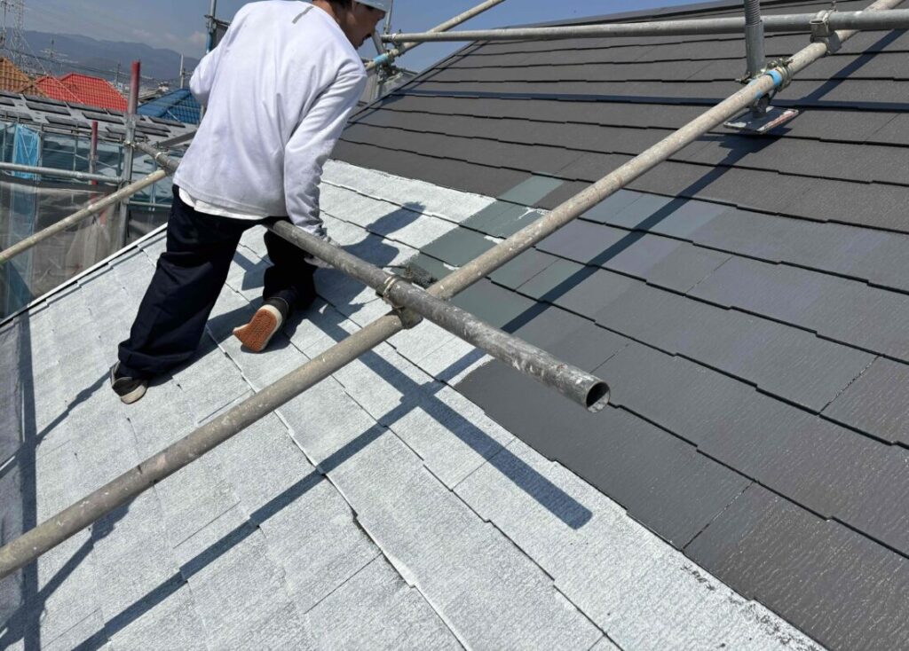屋根の上塗り塗装です。屋根も3回塗りが基本です