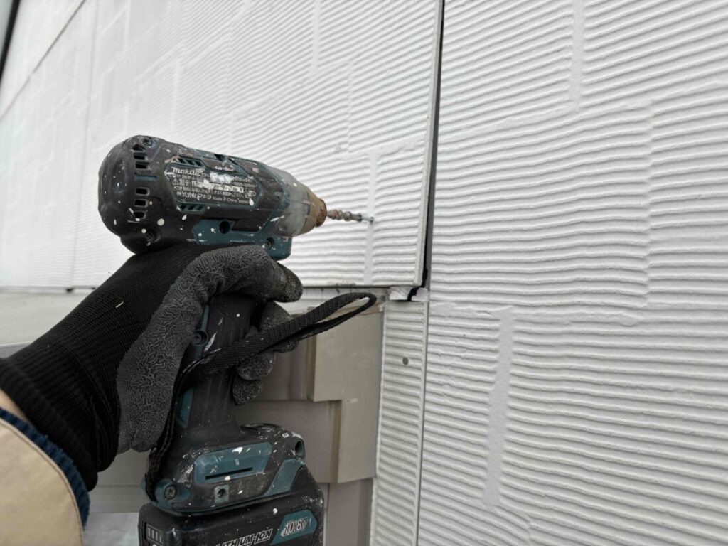新しいビスを打ってサイディングボードの反り補修を行います